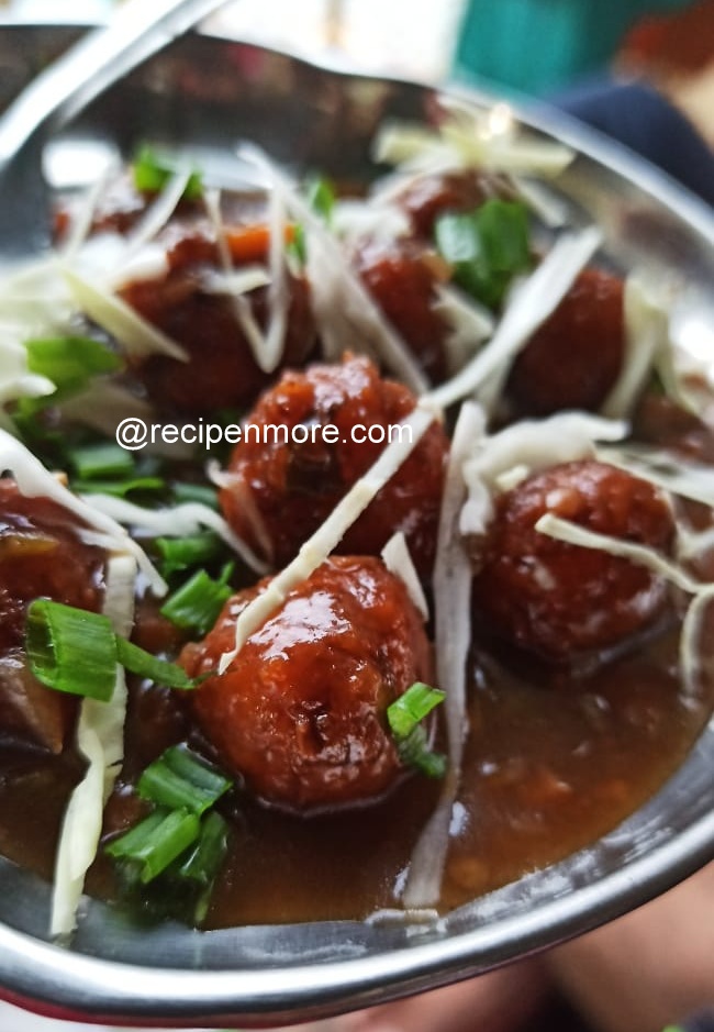 - सेव्हिंग प्लेट मधे तयार गरम गरम मंचुरियन गोळे घेऊन त्यावर ग्रेव्ही, बारीक चिरलेला पातीचा कांदा आणि बारीक चिरलेली कोबी घालावी.